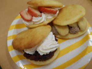 ホットケーキの生地に、あんこやホイップクリーム、チョコレートといちごやバナナなどの果物をはさんだミニどらやきを作っています。中身はお好みの物を選んでいただきました。
